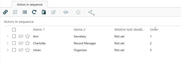 - Vælg en eller flere aktører, som du vil ændre den relative opgavefrist for, på detaljefanen Aktører i sekvens.