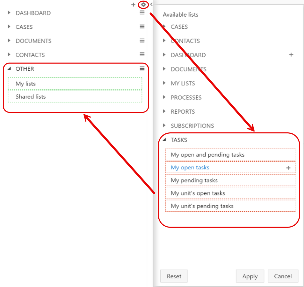 - Du kan tilføje flere lister eller skifte rækkefølgen på eksisterende ruder efter behov. Du kan for eksempel føje listerne Fulgte sager, Læselistesager og Ændrede dokumenter til navigationsruden.