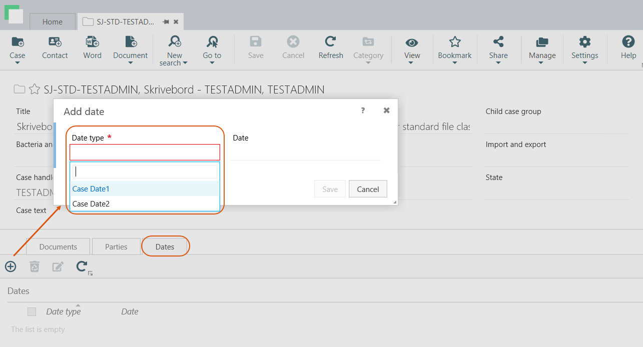 It is possible to specify different date types on cases, documents, and contacts. For example, it could be a contact's birthday, day of retirement, day of a call, and any other date type. In WorkZone Configurator, you can define the date types, and users will see them on the Dates tab in WorkZone Client. When users want to add a new date, they need to click Add, select a date type from the list, and indicate a date.