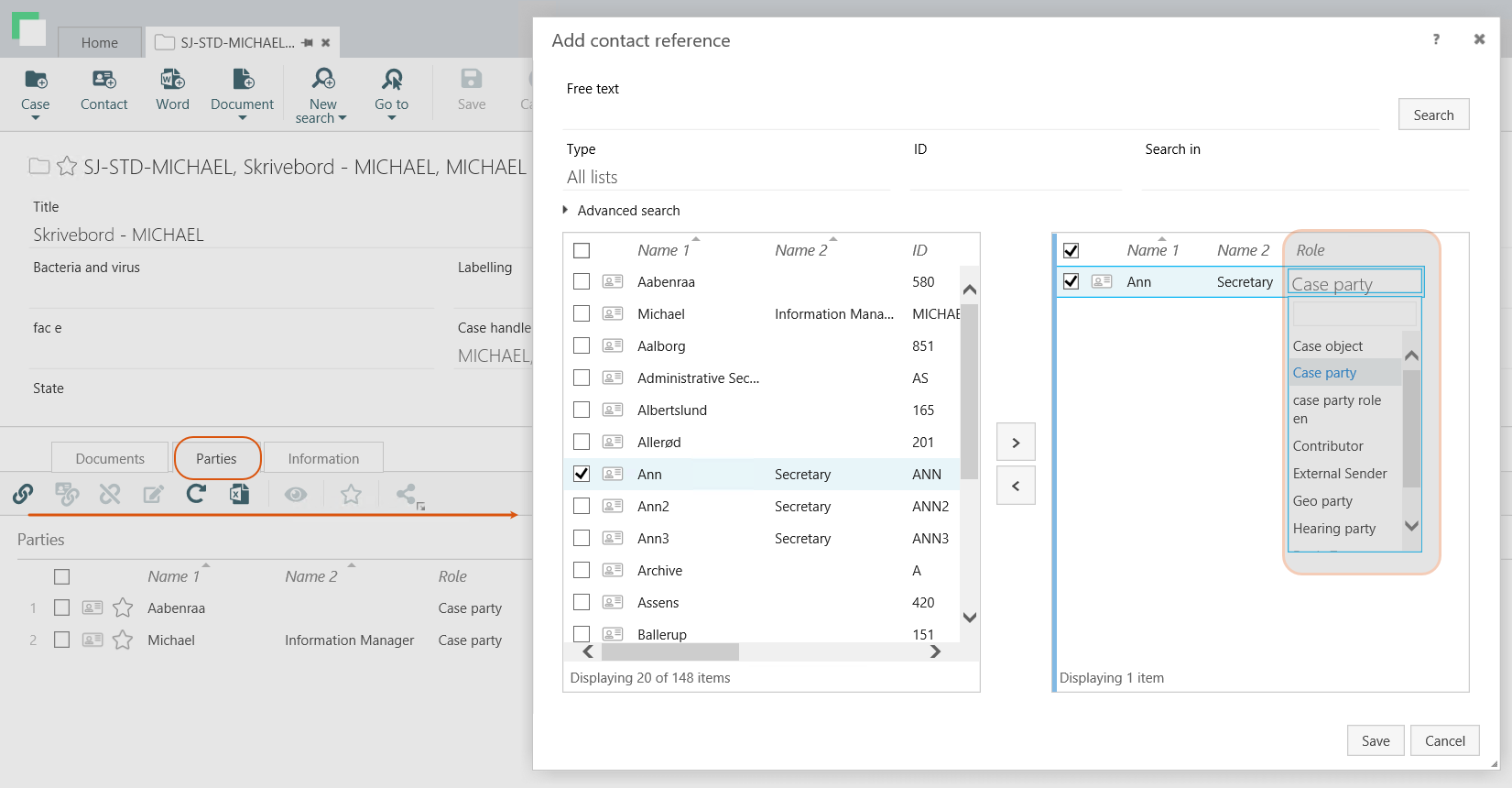 Example: You create the Sender role with the Recipient Reverse code. In WorkZone Client, you open a contact named Ann. You add a new contact reference for Ann. You select Michael, and set his role to Sender. When you open Michael's contact references, you see Ann, and her role is Recipient.