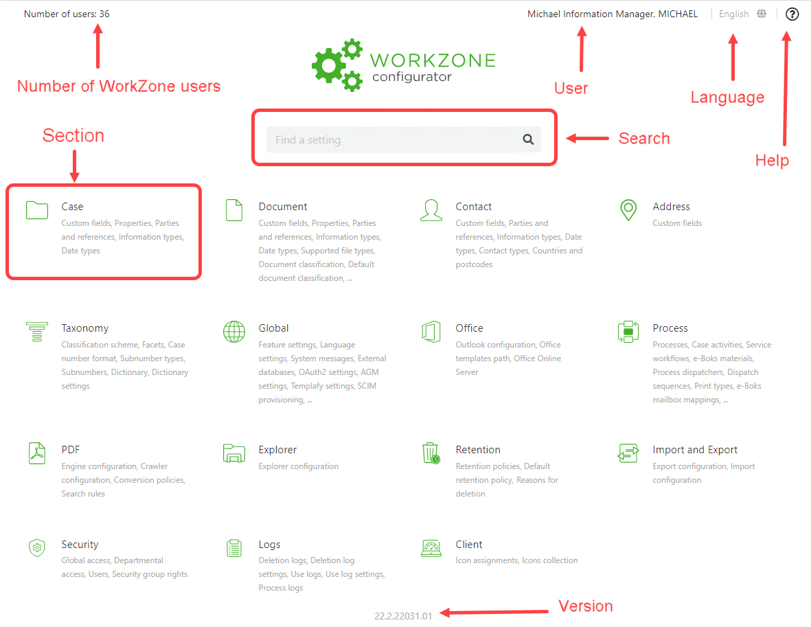 Section: All information that can be configured in WorkZone Configurator is divided into relevant sections. On the start page, you can see the sections' icons, titles, and listed settings that you can configure.
