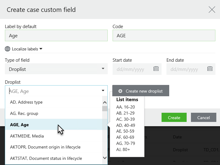 • Create new droplist: Click the button if you want to create a custom droplist that is relevant to your organization. You will be redirected to the Custom droplist page.