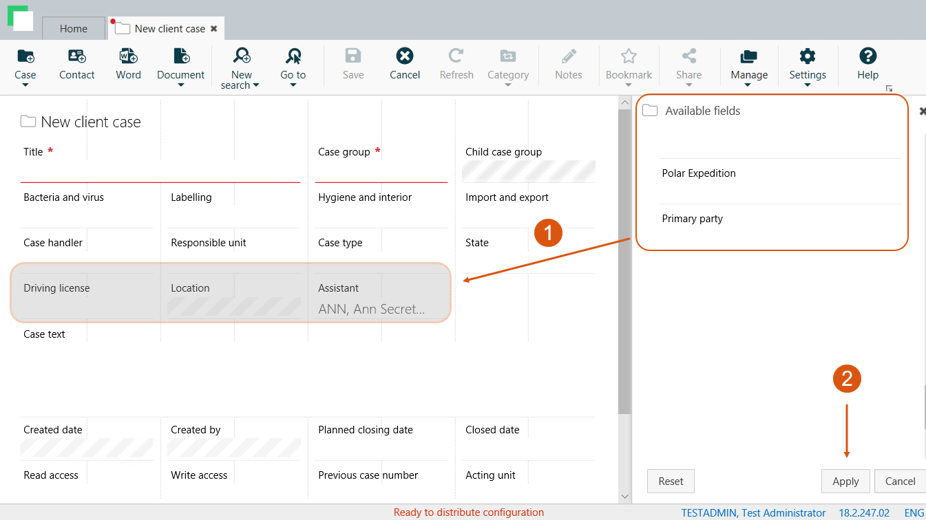 In the following example, Driving license, Location and Assistant are custom fields. An administrator adds them from the Available fields list.