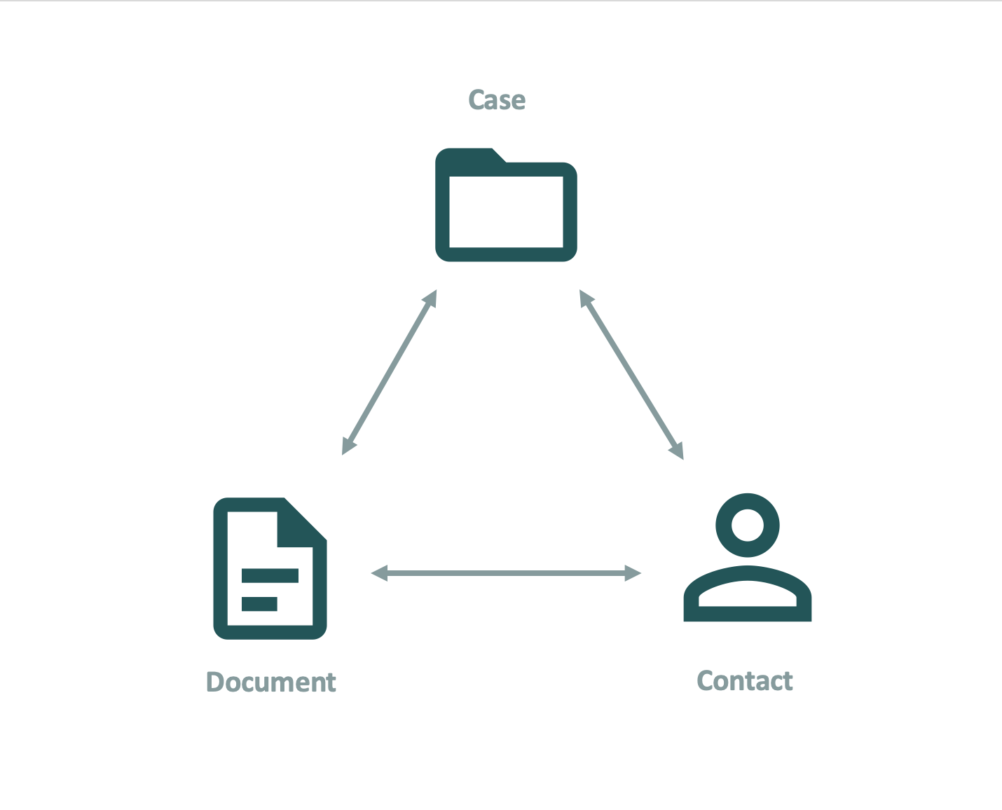 A Case can have Documents and Contacts assigned to it, and each Contact can assume various roles on the case. The same Contact can be assigned to another case with a different role as well.
