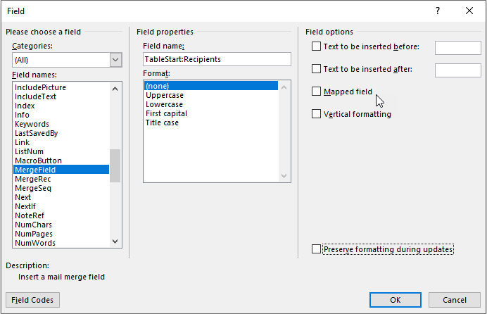 Flettefelterne er struktureret på følgende måde: i krøllede parenteser, MERGEFIELD og derefter alias for feltet, for eksempel, { MERGEFIELD FirstName }.