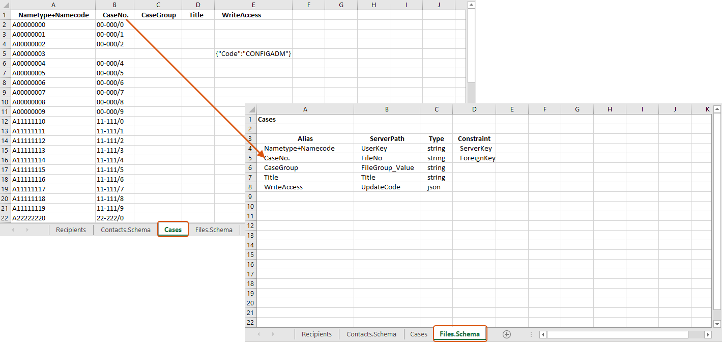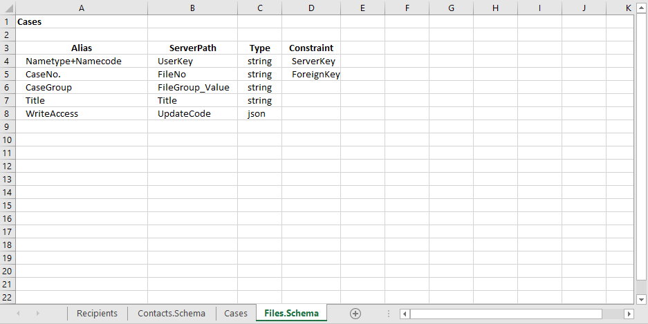 - Files.Schema-påkrævet navn for skema-arket. Dette ark angiver forholdet mellem sager og modtagere i masseforsendelsen, og arket indeholder systemoplysninger om de aliasser, der er angivet i data-arket eller hentet fra WorkZone-databasen. Cellen A1 skal henvise til navnet på data-arket.