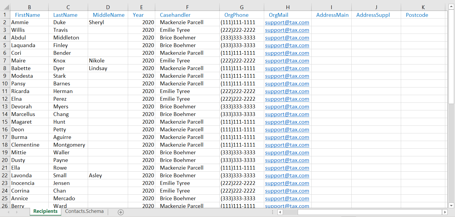 Arket Modtagere indeholder de WorkZone-kontakter, der vil modtage brevene med WorkZone Mass Dispatch og oplysningerne om pågældende kontakter. I dette ark repræsenterer kolonnerne de felter, der angives i arket Contacts.Schema og rækkerne repræsenterer værdier.