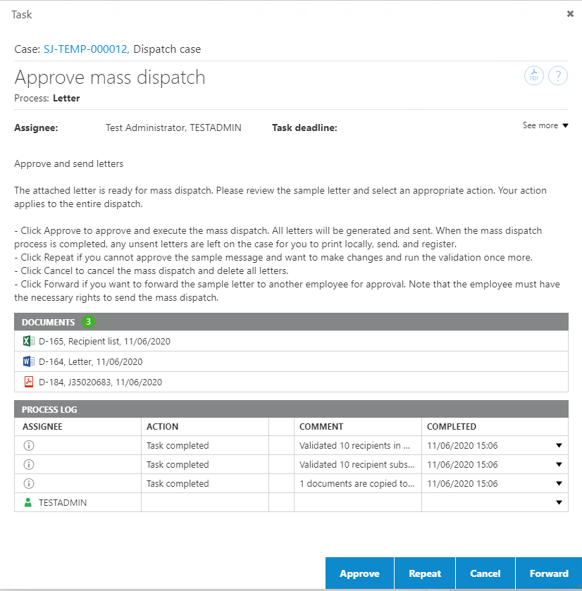 Når du klikker Acceptér, genereres et testbrev på baggrund af brevskabelonen og en af modtagerne i modtagerlisten. Som procesejer vil du modtage en smarttask/smartmail med navnet Godkend masseforsendelse. Se Godkend og send en masseforsendelse.