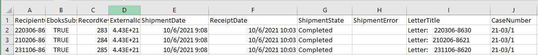Udover historikdokumentet i PDF-format, genererer WorkZone også historikdokumenter i CSV-format. CSV-filen genereres for den fuldførte forsendelse og viser en liste over modtagerne med oplysninger om hver forsendelse. Alt afhængigt af din organisations opsætning, vil der generes en til CSV-fil for hver enkelte forsendelse, som kun viser oplysninger om den aktuelle forsendelse.