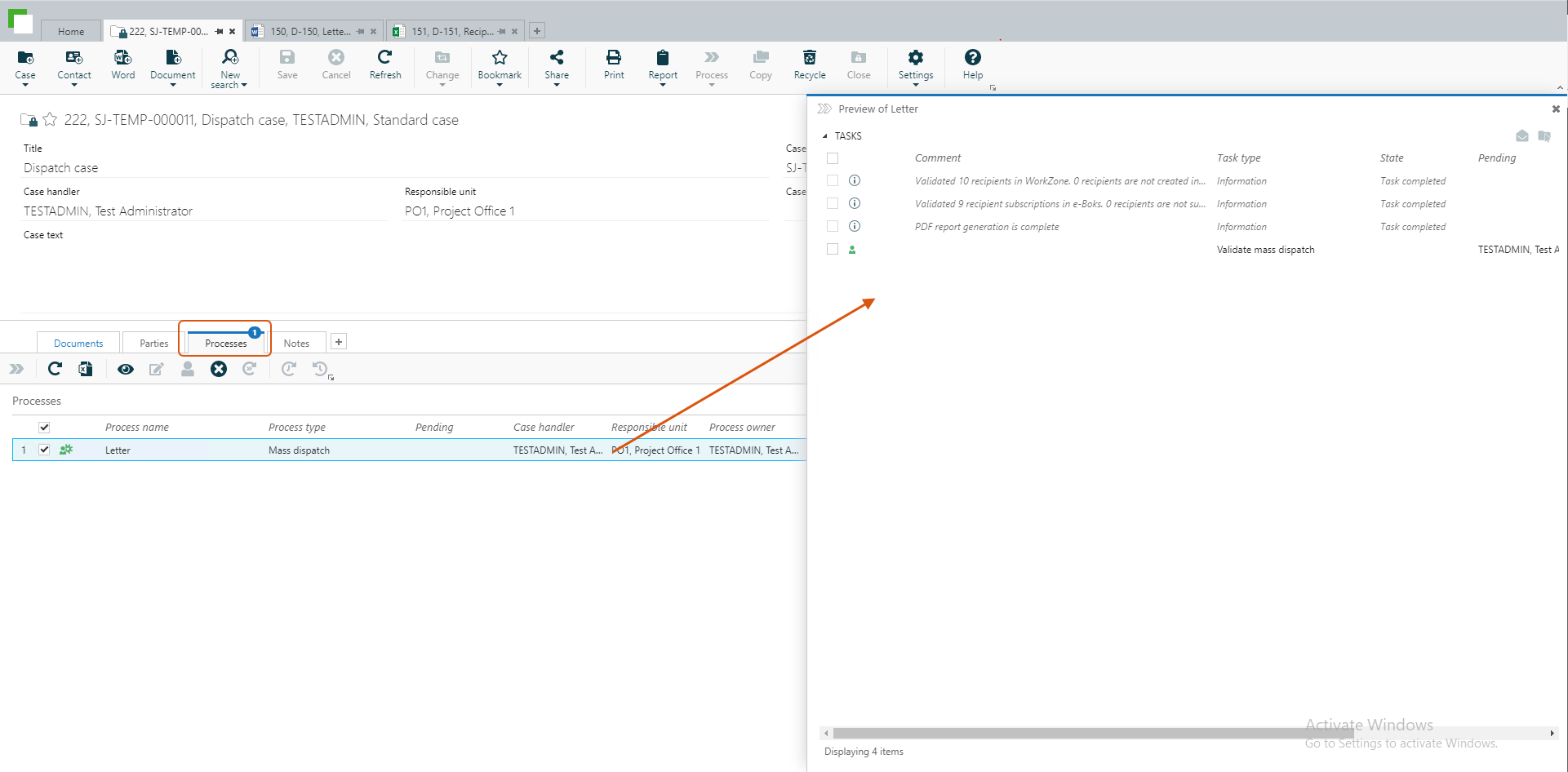 - Klik på fanen Processer og dobbeltklik processen for at åbne den i visningsruden, hvor du kan følge procesforløbet og åbner opgaver, der er relateret til processen.