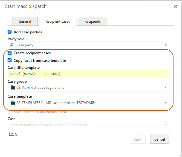 - Tilføj de påkrævede oplysninger om sagstitel, sagsgruppe og angiv den sagsskabelon, som de nye modtagersager skal baseres på.