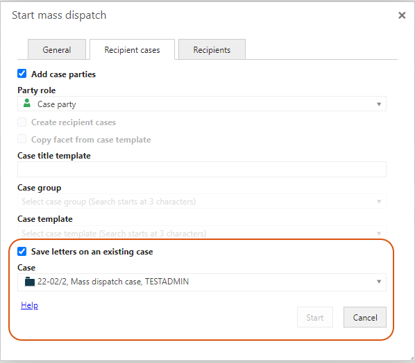 - Markér afkrydsningsfeltet Opret modtagersager, hvis der skal oprettes en ny sag for hver modtager i masseforsendelsen, hvor brevene skal gemmes. Der oprettes ikke nye sager for de modtagere, der har henvisninger til eksisterende sager i Arket Cases (Sager) (med en foreign key kolonne).