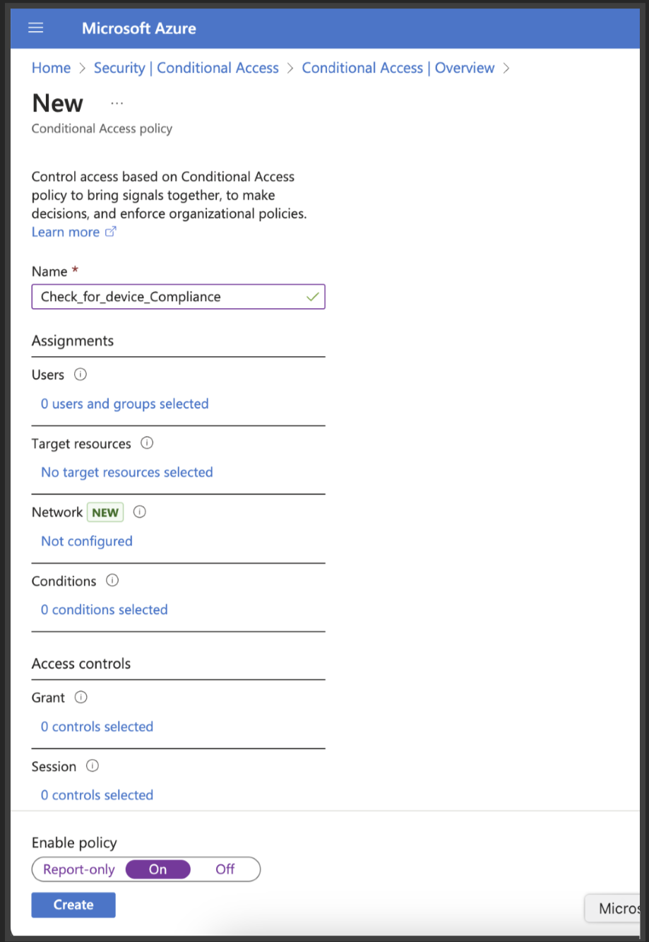- Type name of the policy into the Name field. For example, Check_for_device_Compliance.