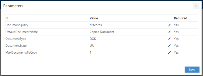 1. Select a WorkZone activity, for example CopyDocument, and a list of parameters for the selected type is shown.