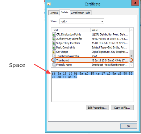 - Mark the thumbprint without the first space and press Ctrl + C to copy the thumbprint.