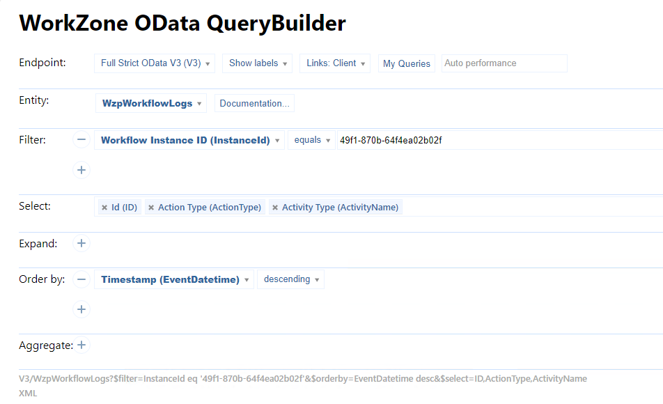 3. Use WorkZone QueryBuilder to extract information about a specific failed SmartPost process from the workflow log that includes the NgDP requests by filtering on: