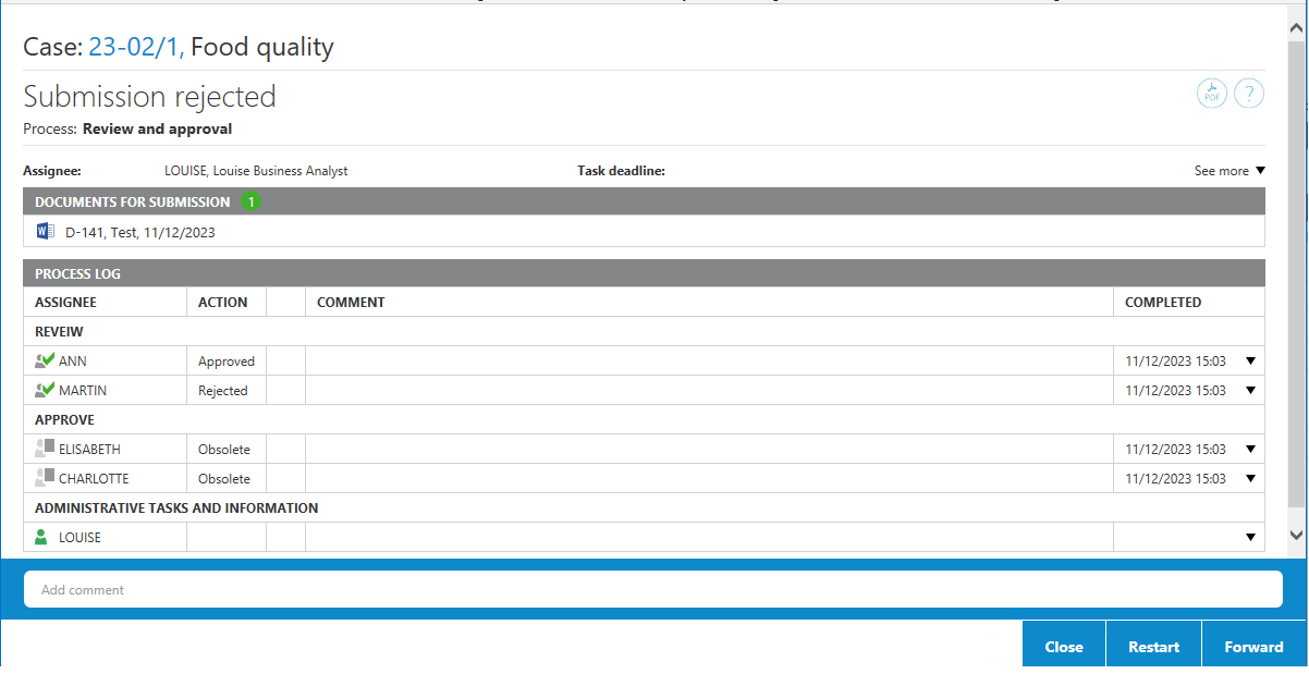 - Klik Videresend for at videresende opgaven til en anden person eller organisatorisk enhed, som så skal vurdere, om processen skal lukkes.