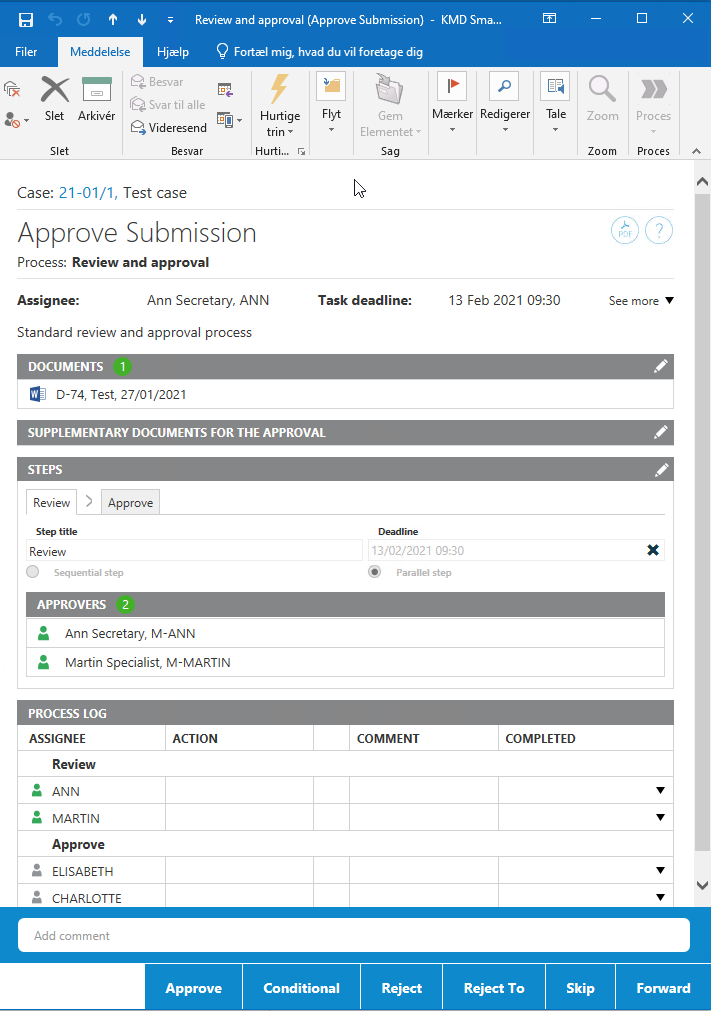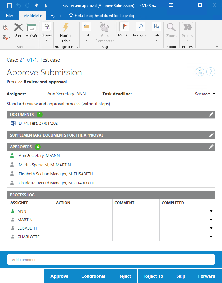 - Procesejeren kan også vælge at videresende opgaven til anden, som herefter vil være ansvarlig for at redigere dokumenter og fjerne eller tilføje godkendere. En opgave til den nye godkender vil blive føjet til processen. Når godkenderen har foretaget sine ændringer i dokumenterne og godkender dem, vil forelægelsesprocessen blive genstartet.