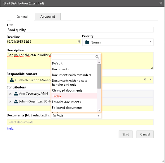 - I dialogen Start Fordeling (Udvidet), indsættes sagstitlen automatisk i feltet Titel.