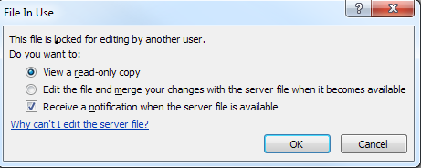 Microsoft Office-dialogboksen nedenfor, vises når en anden (eller tredje) bruger åbner et dokument, der allerede bliver redigeret af en anden: