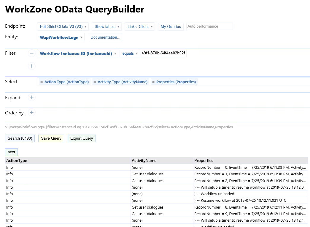 2. Select WzpWorkflowLogs in the Entity field.