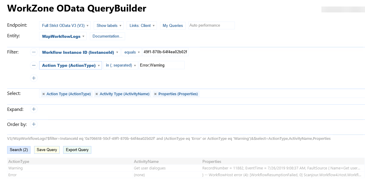 Start by copying the process instance ID from the notification email, the SmartPost history document, or from the query result. Now, you can use WorkZone QueryBuilder or WorkZone Configurator to extract errors and warnings for the specific process.