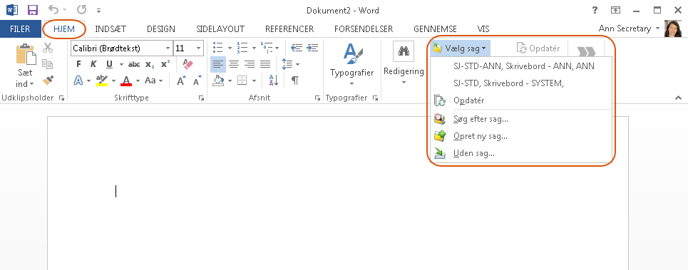 - Klik Vælg sag på fanen Startside i gruppen Sag. Der vises en liste med valgmuligheder.