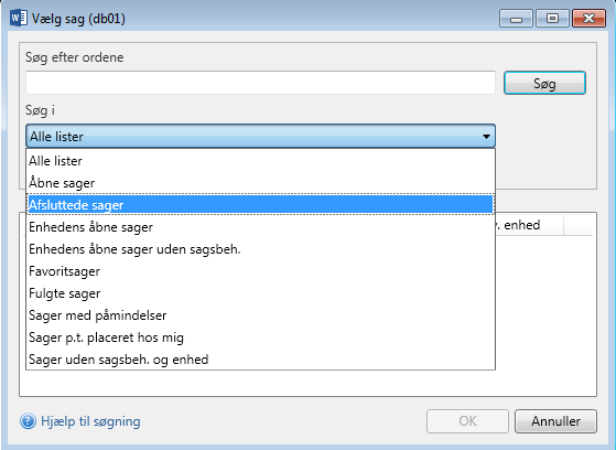 - For at finde en sag via et ord, som teksten indeholder, kan du indtaste fritekst i Søg efter ordene.
