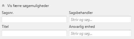 - For at søge efter sagsnummer, titel, sagsbehandler eller ansvarlig enhed, klik Vis flere søgemuligheder. Klik Vis færre søgemuligheder, for at skjule sektionen.