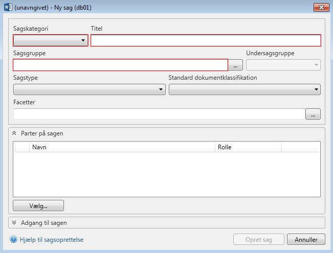 - Indtast relevante oplysninger om sagen, samt felterne markeret i rødt, der er obligatoriske.