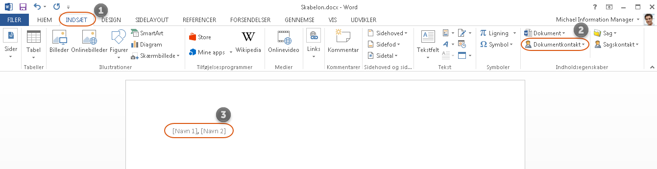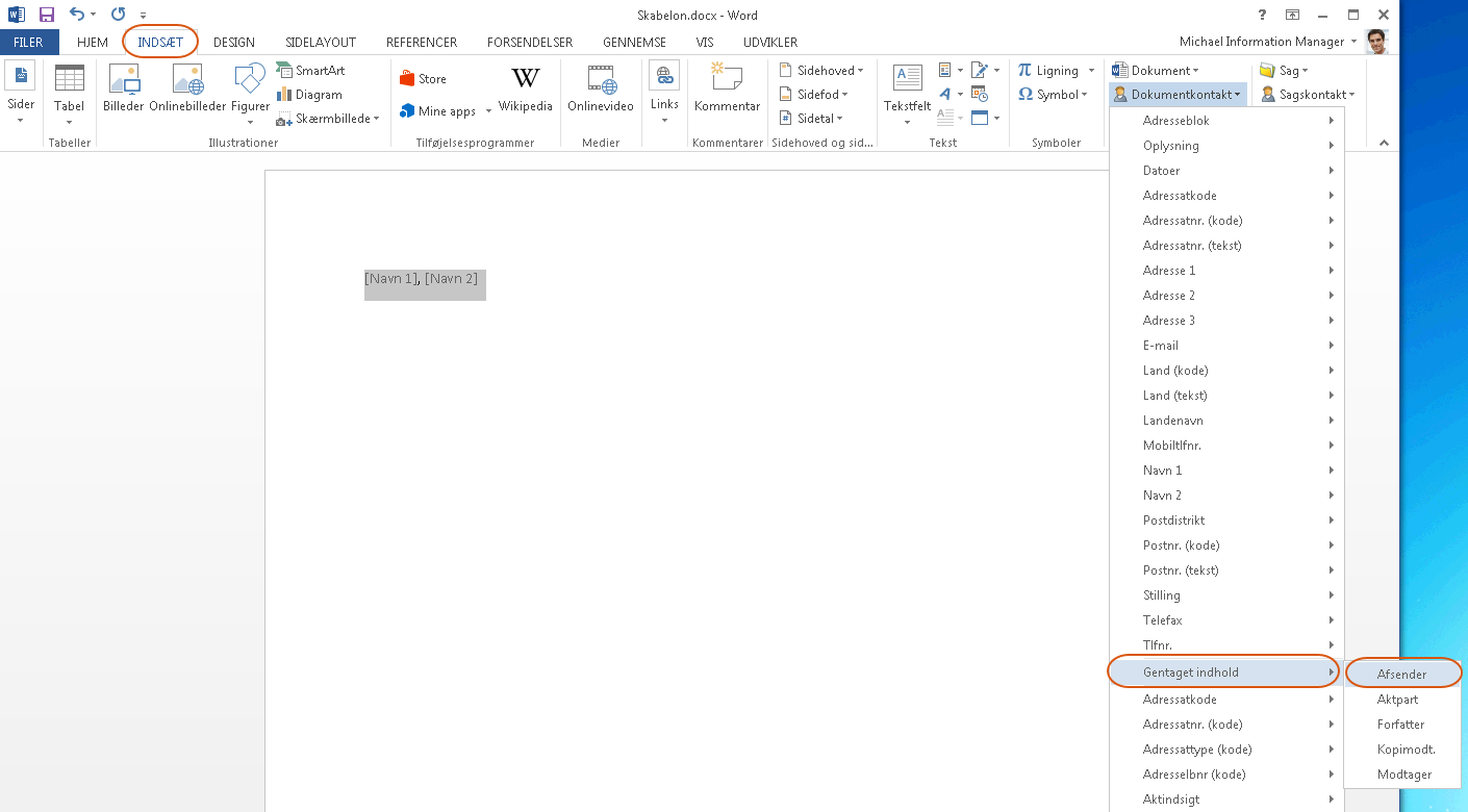 Klik på et indholdskontrolelement fra en relevant gruppe på fanen Indsæt i gruppen Indholdsegenskaber, og vælg den egenskab, du vil indsætte. Hvis du, for eksempel, vil indsætte navne på alle de parter, der har rollen som Afsender, skal du tilføje indholdskontrolelementerne Navn 1 og Navn 2 med rollen Afsender.