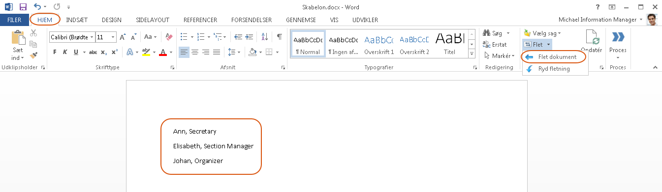 Der oprettes et nyt dokument, når du klikker Flet. Tekst fra skabelonen med bestemte værdier for hver modtager bliver indsat på en ny side.