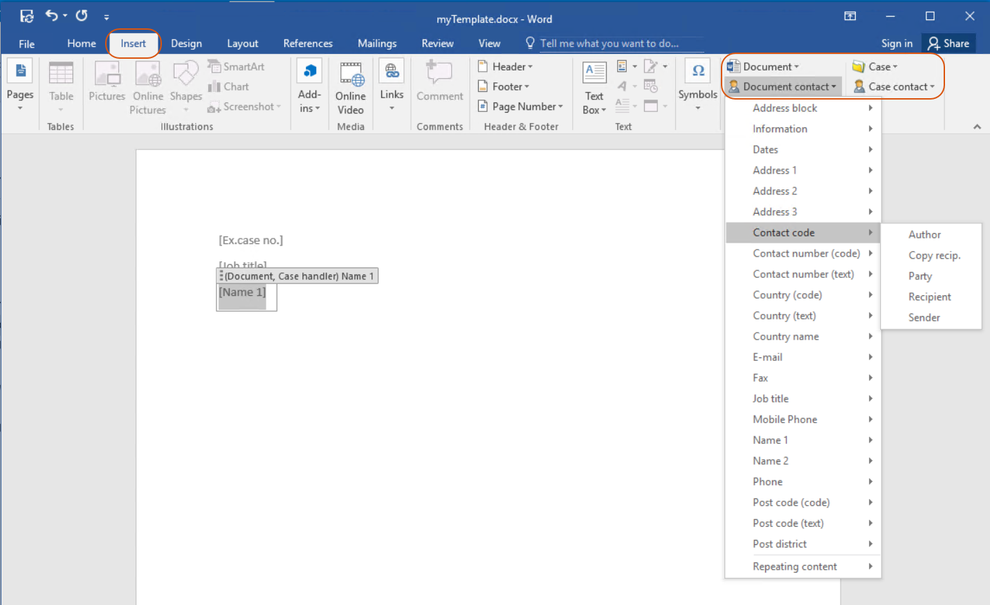 Flet oplysninger om sager, dokumenter og kontakter ind i dine dokumenter