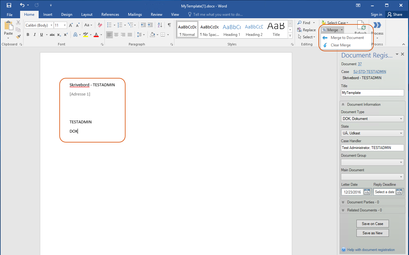 I Microsoft Word kan du benytte flettefunktionen til at indsætte oplysninger i indholdskontrolelementerne i dokumentet, for eksempel om den sag, der er valgt for dit dokument.