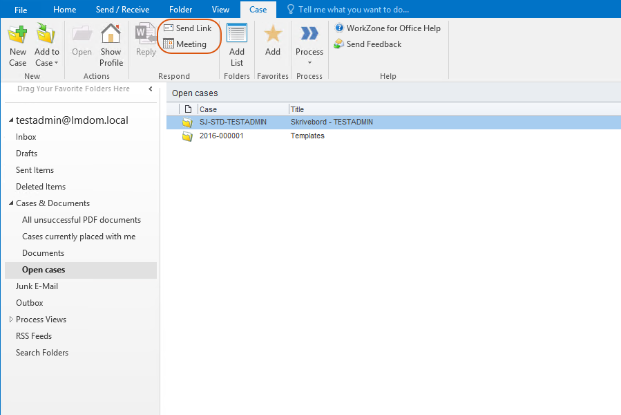 Du kan indsætte et link til en sag eller et dokument i en ny mail eller mødeindkaldelse. Hvis du deler et link til et dokument, indsættes to links: Det første åbner dokumentet i WorkZone Client og det andet er et download-link.