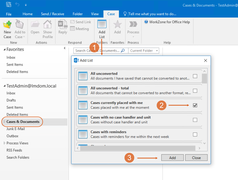 Du kan føje sags- og dokumentlister til din mappe Sager & dokumenter i Microsoft Outlook. For at gøre dette skal du klikke på knappen Tilføj liste på fanen Sag, vælge de ønskede lister og klikke Tilføj. Du kan nu få vist en ønsket liste i Microsoft Outlook ved at klikke en enkelt gang med musen.