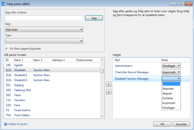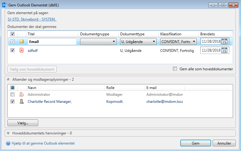 Kontakterne angivet i felterne Til, Cc og Fra på det gemte Outlook-element bruges automatisk som dokumentparter. Derudover søger systemet efter yderligere matchende kontakter til registrering, når du gemmer et Outlook-element på en sag eller opretter en ny sag.