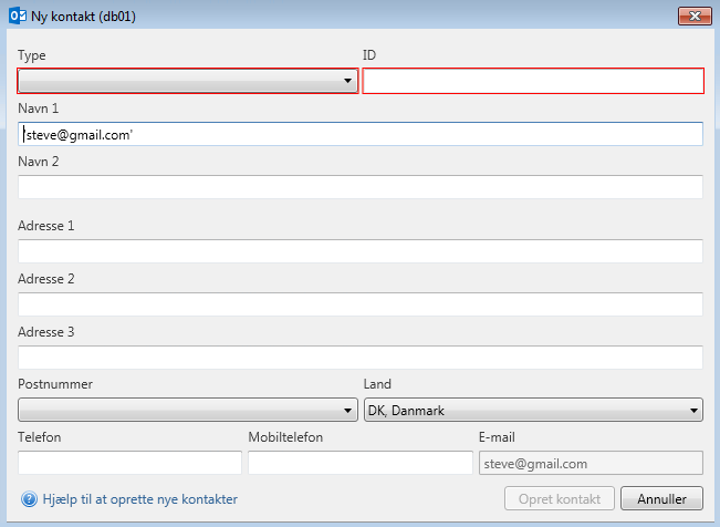 - Klik Opret ny kontakt. Dialogen Ny kontakt vises. Feltet til mailadresse udfyldes automatisk.
