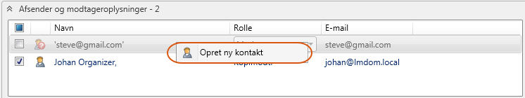 Hvis Outlook-elementet indeholder en ukendt kontakt (det vil sige en kontakt med en mailadresse, der ikke findes på en eksisterende part), kan du gemme kontakten som en ny kontakt.
