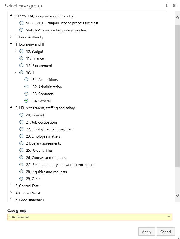 Case groups represent a classification scheme for cases and is a mandatory field. A case group can have sub-groups, which further categorize the case. Case groups are part of your organization's classification scheme and are defined by an administrator in the WorkZone Configurator > Taxonomy > Classification scheme.