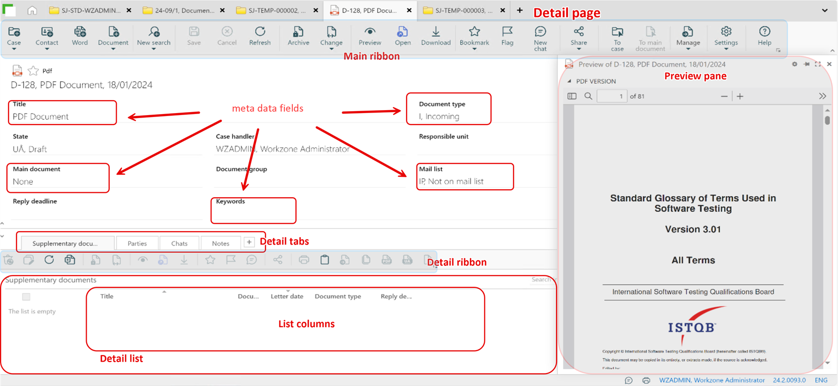 For example, if you have a document detail page open, the detail tabs will display detail lists of the cases and contacts linked to this document. For searches, the list of search results is displayed.