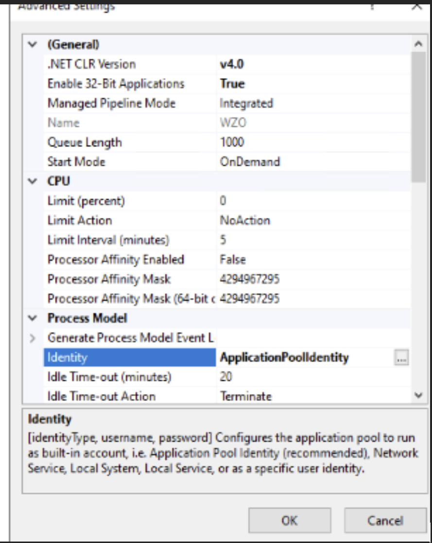 - Right-click the WZO application pool and select Advanced settings.