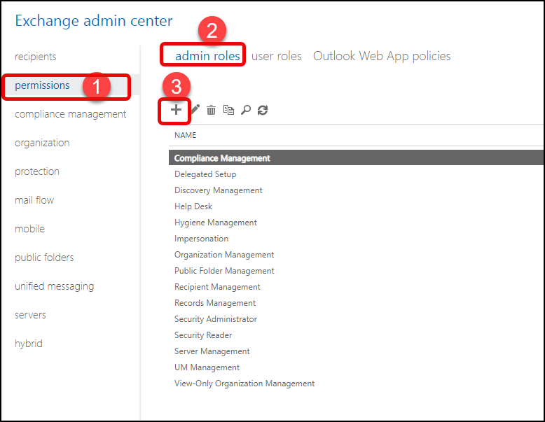 https://[your_exchange_server]/ecp/, replacing the [your_exchange_server] with your Exchange server. For example, https://workzone/ecp/. - On the permissions tab, select admin roles and click +.