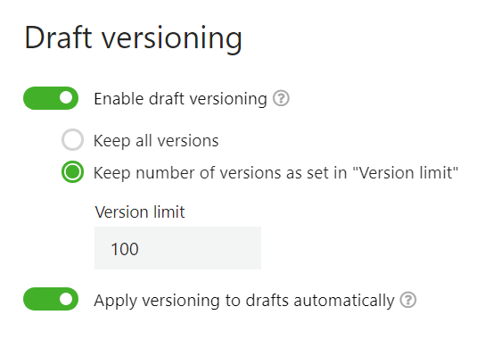 - Apply versioning to drafts automatically ā Activates the draft versioning functionality for users automatically.