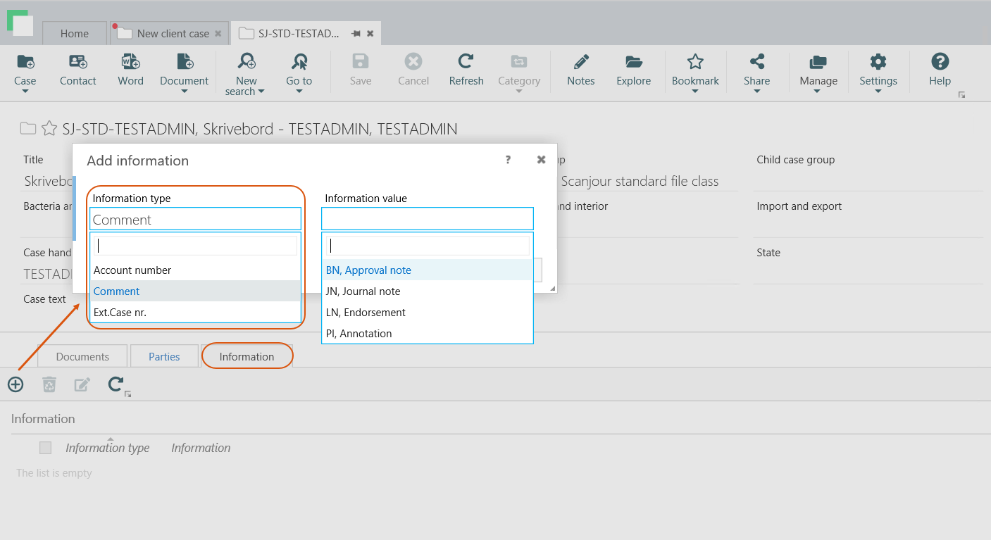 It is possible to specify additional structured information on cases, documents, and contacts. For example, it could be involved towns, companies, building numbers, and any other information. In WorkZone Configurator, you can define the information types, and users will see them on the Information tab in WorkZone Client. When users want to add new information, they need to click