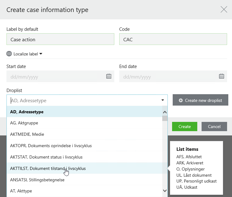 - Create new droplist – Click the button if you want to create a custom droplist that is relevant to your organization. You will be redirected to the Custom droplist page.