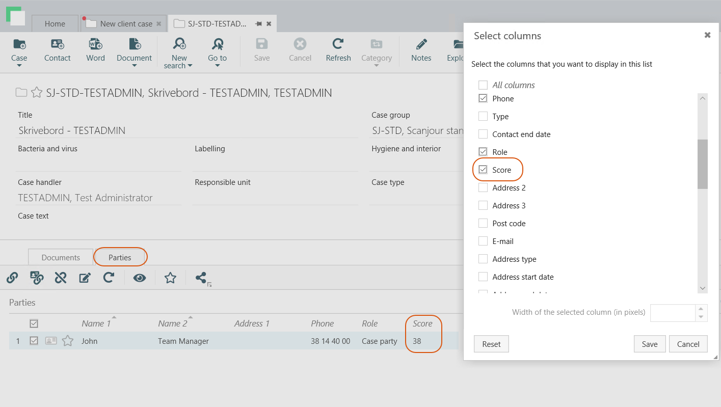 - Case parties: These custom fields are only available on the Parties tab on cases. Use these fields to define additional content that connects a specific case with a specific contact. To see a custom field in WorkZone Client, right-click the table headings and add a new column.