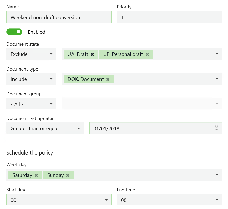 The policy converts all documents of the type DOKUMENT that are not drafts and have been changed within 2018 year. The conversion is scheduled on weekend nights to ensure that load on servers won't affect employees' regular work.