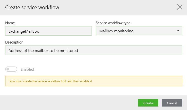 A service workflow is a workflow that runs continuously in the environment where it is started. The service workflow can start any kind of workflow, based on the defined service parameters. One example of a service workflow is a workflow that monitors a mailbox, and starts workflows based on incoming mails.