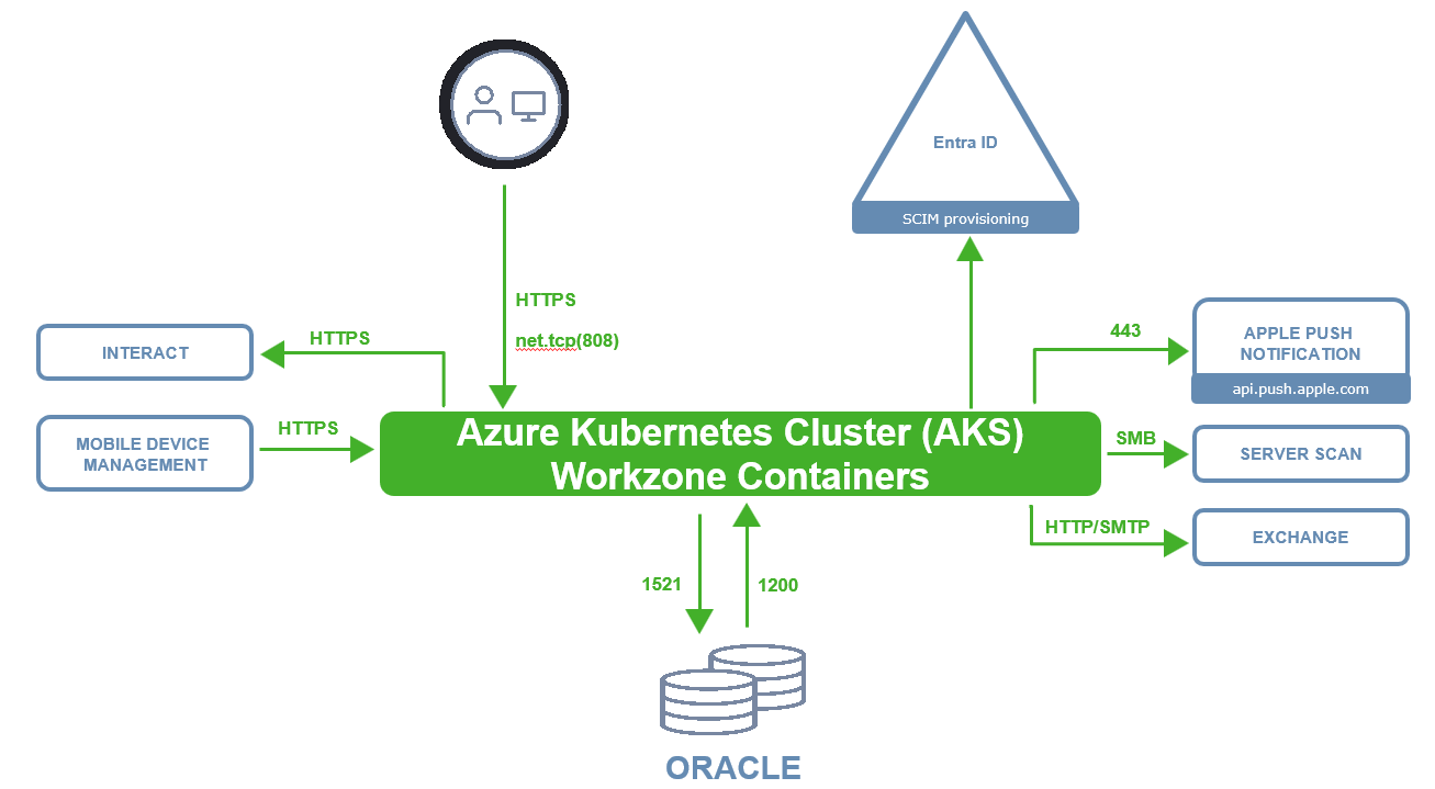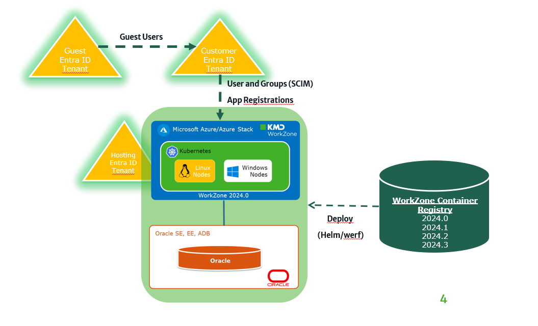 - Entra ID Integration – The authentication and authorization model for WorkZone is based on Microsoft Entra ID as a provider. The user authentication is based on Entra ID and the authorization is based on Entra ID groups that are synchronized by the Entra ID SCIM protocol. See Enroll WorkZone - Cloud Edition in Azure and set up SCIM provisioning.